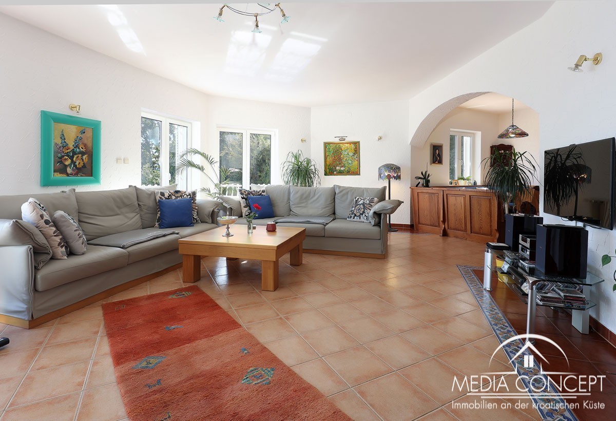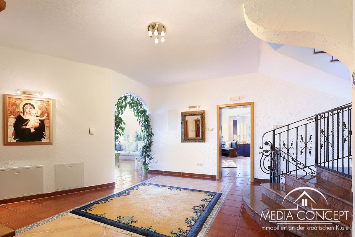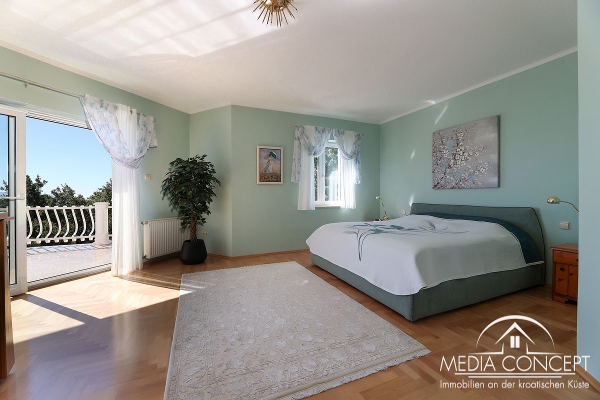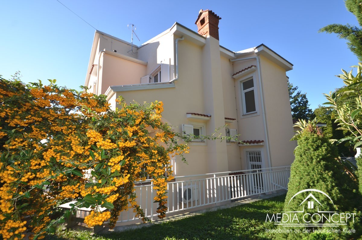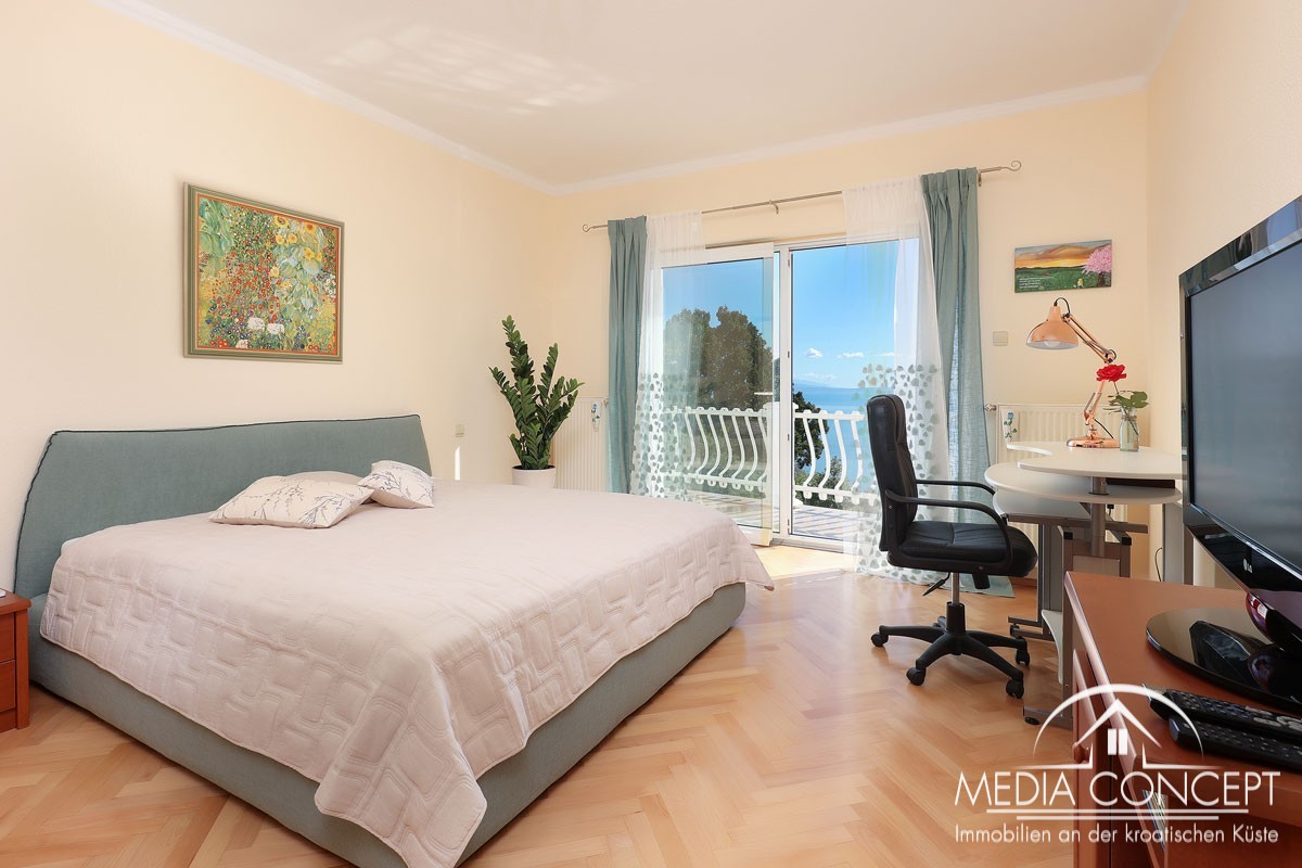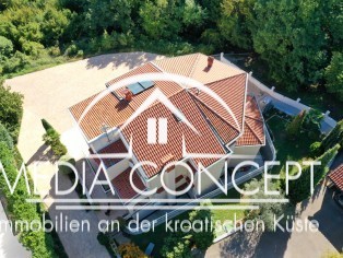 Traumhafte Villa auf halbhöhen Lage über Opatija mit atemberaubende, unverbaubare Panoramablick auf die Kvarnerbucht. Diese 2001, in einer Sackgasse fertiggestellte Villa, bietet auf ca 400 m2 Wohnfläche und auf 1.374 m2 gepflegtem Grundstück, ein hohes Maß an Exklusivität mit modernste luxuriöse Ausstattung. Gesamte Grundstück hat ca. 3.300 m2. Edle Baumaterialien in handwerklich hochwertiger Ausführung verkörpern die Besonderheit des Objektes (schmiedeeiserne Geländer, Betontreppe mit Granit verkleidet, Vollholzzimmertüren, Garderobenzimmer in Volleiche, Dampfbad "Hösch" Sanitäreinrichtung - Duravit -Armaturen "Grohe"). Die ca 400 m2 Wohnfläche verteilen sich über drei Etagen. Der überaus umfangreiche Wohnzimmer mit Landschaftskamin, Luxuseinbauküche und Ess-bereich bilden den Mittelpunkt der ersten Etage. Außerdem, befinden sich in dieser Etage noch ein Schlafzimmer mit Bad, Abstellraum und Gäste-Toilette. In er zweiten Etage befinden sich weitere zwei Schlafzimmer, jedes mit eigenem Bad, Garderobenzimmer und Bibliothek. Alle Zimmer in dem Haus sind lichtdurchflutet, führen zum einladenden Balkon und haben atemberaubenden Panoramablick. In Erdgeschoss befindet sich ein ca 60 m2 großes Büro, Sommerküche, Werkstatt, Dampfbad und Heizungsraum. Nach bedarf kann man aus dieser Etage eine gesonderte Wohnung erstellen. Nasszellen, Wohn - Ess-Bereich und die Küche sind mit hochwertigen spanischen und italienischen Fließen gefliesst und haben zu der klassischen Ölzentralheizung auch die Fußbodenheizung. Mit Whirlpool, Dampfbad "Hösch", exklusive