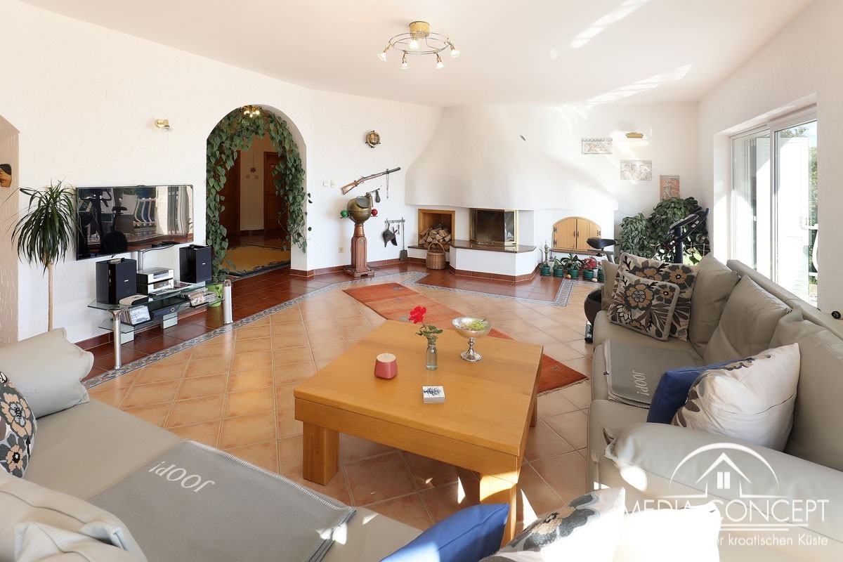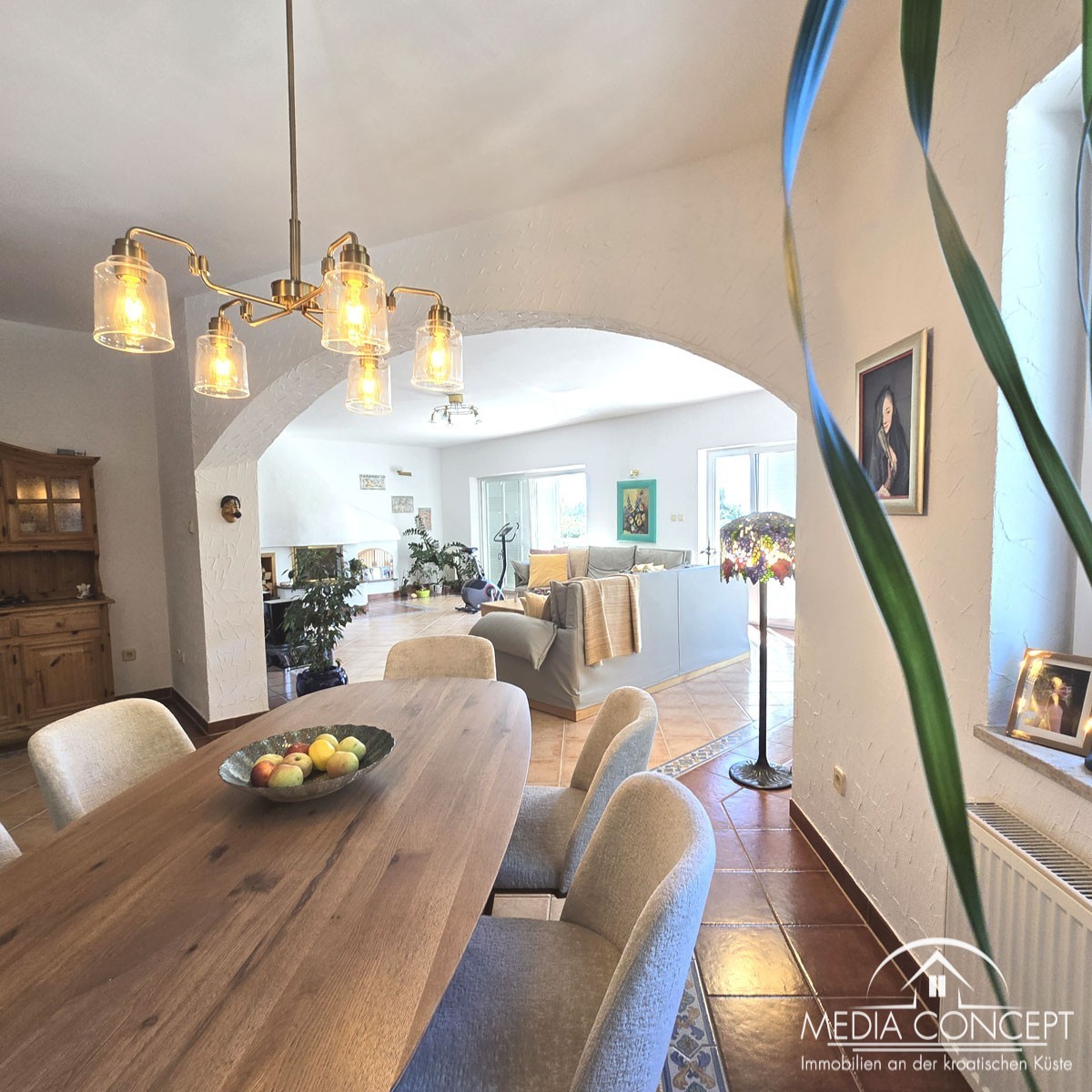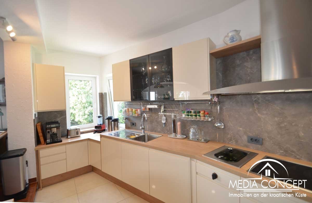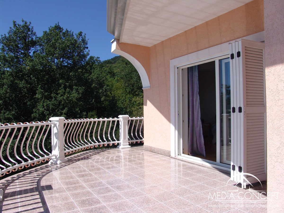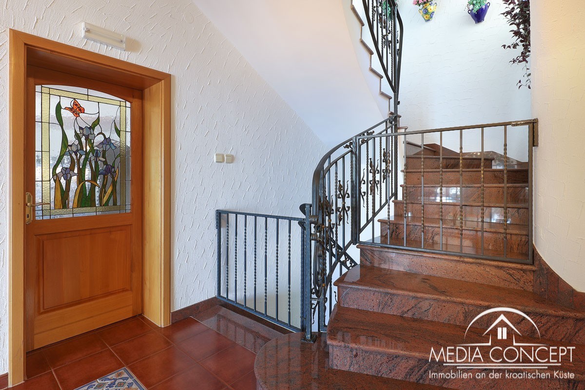 Traumhafte Villa auf halbhöhen Lage über Opatija mit atemberaubende, unverbaubare Panoramablick auf die Kvarnerbucht. Diese 2001, in einer Sackgasse fertiggestellte Villa, bietet auf ca 400 m2 Wohnfläche und auf 1.374 m2 gepflegtem Grundstück, ein hohes Maß an Exklusivität mit modernste luxuriöse Ausstattung. Gesamte Grundstück hat ca. 3.300 m2. Edle Baumaterialien in handwerklich hochwertiger Ausführung verkörpern die Besonderheit des Objektes (schmiedeeiserne Geländer, Betontreppe mit Granit verkleidet, Vollholzzimmertüren, Garderobenzimmer in Volleiche, Dampfbad "Hösch" Sanitäreinrichtung - Duravit -Armaturen "Grohe"). Die ca 400 m2 Wohnfläche verteilen sich über drei Etagen. Der überaus umfangreiche Wohnzimmer mit Landschaftskamin, Luxuseinbauküche und Ess-bereich bilden den Mittelpunkt der ersten Etage. Außerdem, befinden sich in dieser Etage noch ein Schlafzimmer mit Bad, Abstellraum und Gäste-Toilette. In er zweiten Etage befinden sich weitere zwei Schlafzimmer, jedes mit eigenem Bad, Garderobenzimmer und Bibliothek. Alle Zimmer in dem Haus sind lichtdurchflutet, führen zum einladenden Balkon und haben atemberaubenden Panoramablick. In Erdgeschoss befindet sich ein ca 60 m2 großes Büro, Sommerküche, Werkstatt, Dampfbad und Heizungsraum. Nach bedarf kann man aus dieser Etage eine gesonderte Wohnung erstellen. Nasszellen, Wohn - Ess-Bereich und die Küche sind mit hochwertigen spanischen und italienischen Fließen gefliesst und haben zu der klassischen Ölzentralheizung auch die Fußbodenheizung. Mit Whirlpool, Dampfbad "Hösch", exklusive