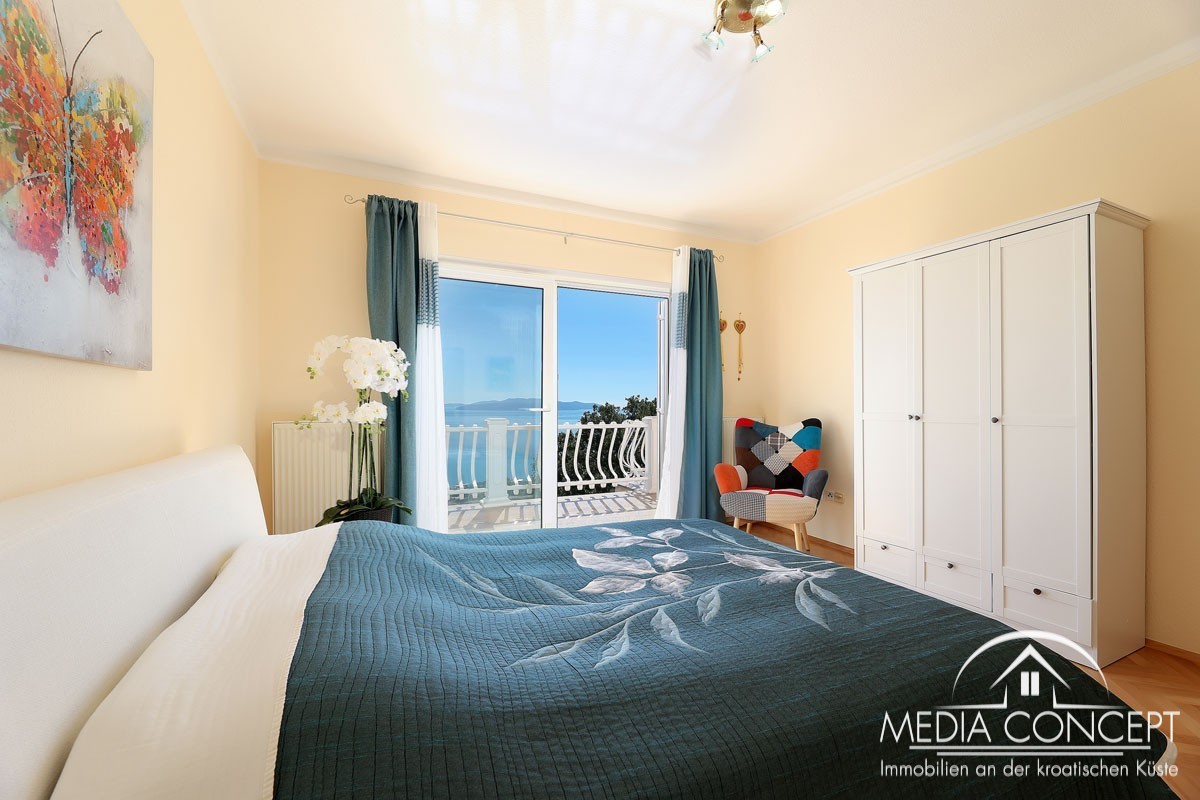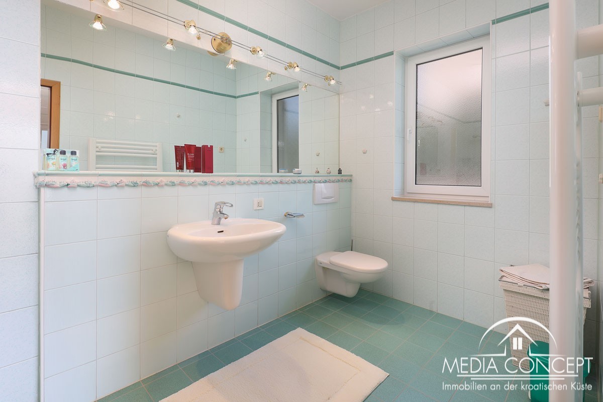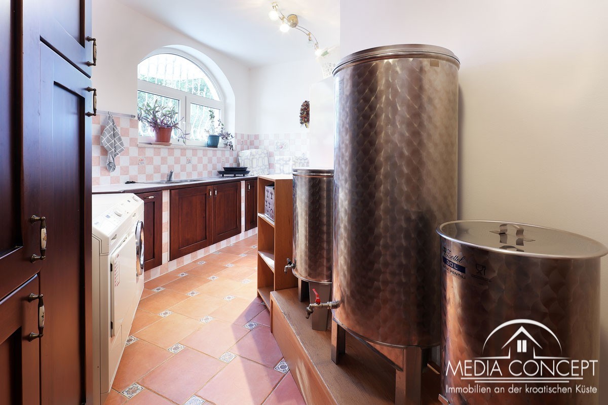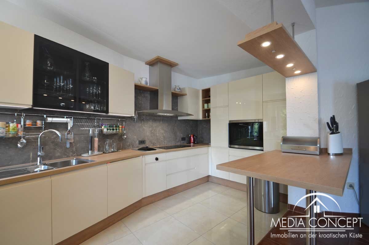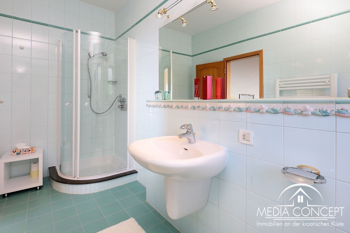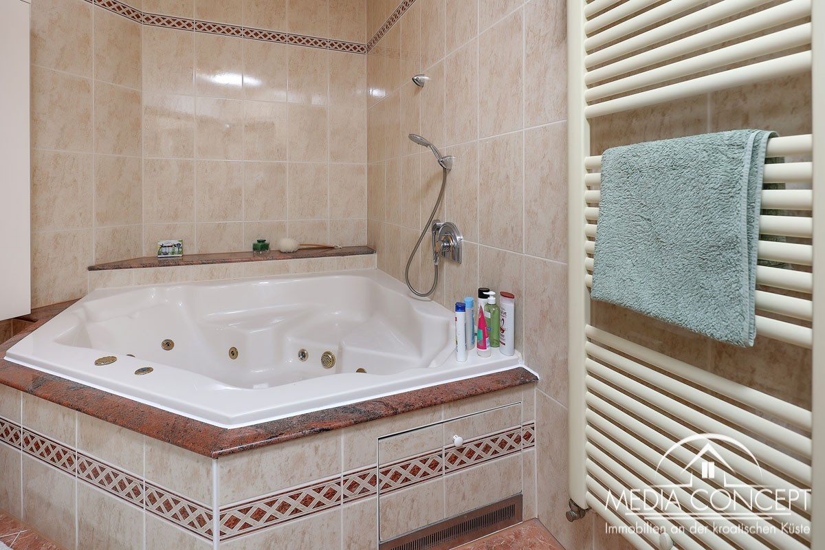 Traumhafte Villa auf halbhöhen Lage über Opatija mit atemberaubende, unverbaubare Panoramablick auf die Kvarnerbucht. Diese 2001, in einer Sackgasse fertiggestellte Villa, bietet auf ca 400 m2 Wohnfläche und auf 1.374 m2 gepflegtem Grundstück, ein hohes Maß an Exklusivität mit modernste luxuriöse Ausstattung. Gesamte Grundstück hat ca. 3.300 m2. Edle Baumaterialien in handwerklich hochwertiger Ausführung verkörpern die Besonderheit des Objektes (schmiedeeiserne Geländer, Betontreppe mit Granit verkleidet, Vollholzzimmertüren, Garderobenzimmer in Volleiche, Dampfbad "Hösch" Sanitäreinrichtung - Duravit -Armaturen "Grohe"). Die ca 400 m2 Wohnfläche verteilen sich über drei Etagen. Der überaus umfangreiche Wohnzimmer mit Landschaftskamin, Luxuseinbauküche und Ess-bereich bilden den Mittelpunkt der ersten Etage. Außerdem, befinden sich in dieser Etage noch ein Schlafzimmer mit Bad, Abstellraum und Gäste-Toilette. In er zweiten Etage befinden sich weitere zwei Schlafzimmer, jedes mit eigenem Bad, Garderobenzimmer und Bibliothek. Alle Zimmer in dem Haus sind lichtdurchflutet, führen zum einladenden Balkon und haben atemberaubenden Panoramablick. In Erdgeschoss befindet sich ein ca 60 m2 großes Büro, Sommerküche, Werkstatt, Dampfbad und Heizungsraum. Nach bedarf kann man aus dieser Etage eine gesonderte Wohnung erstellen. Nasszellen, Wohn - Ess-Bereich und die Küche sind mit hochwertigen spanischen und italienischen Fließen gefliesst und haben zu der klassischen Ölzentralheizung auch die Fußbodenheizung. Mit Whirlpool, Dampfbad "Hösch", exklusive