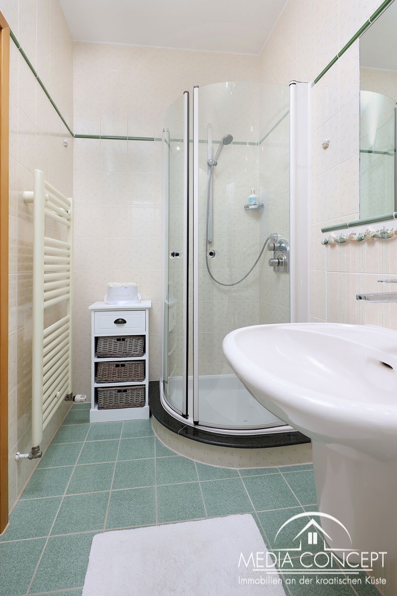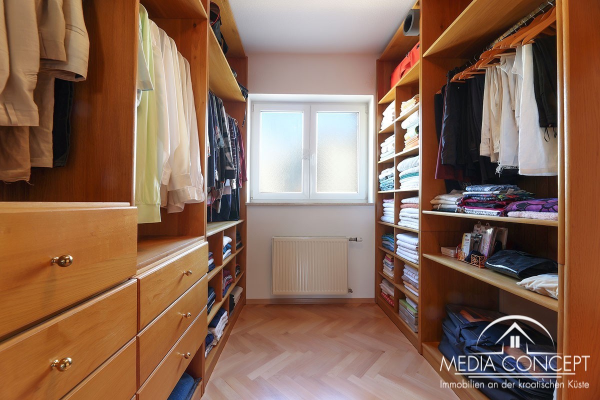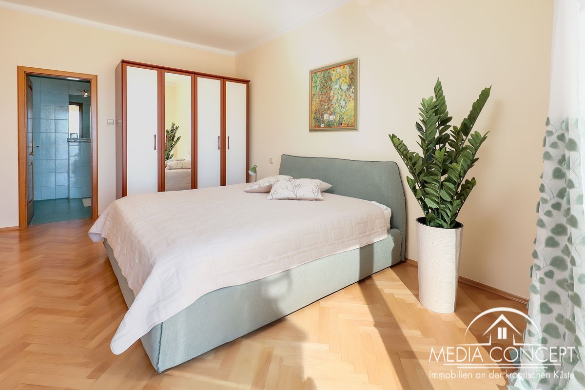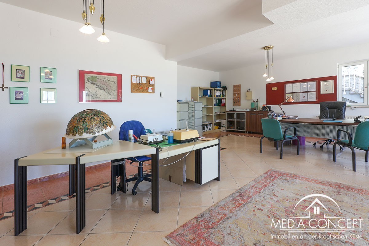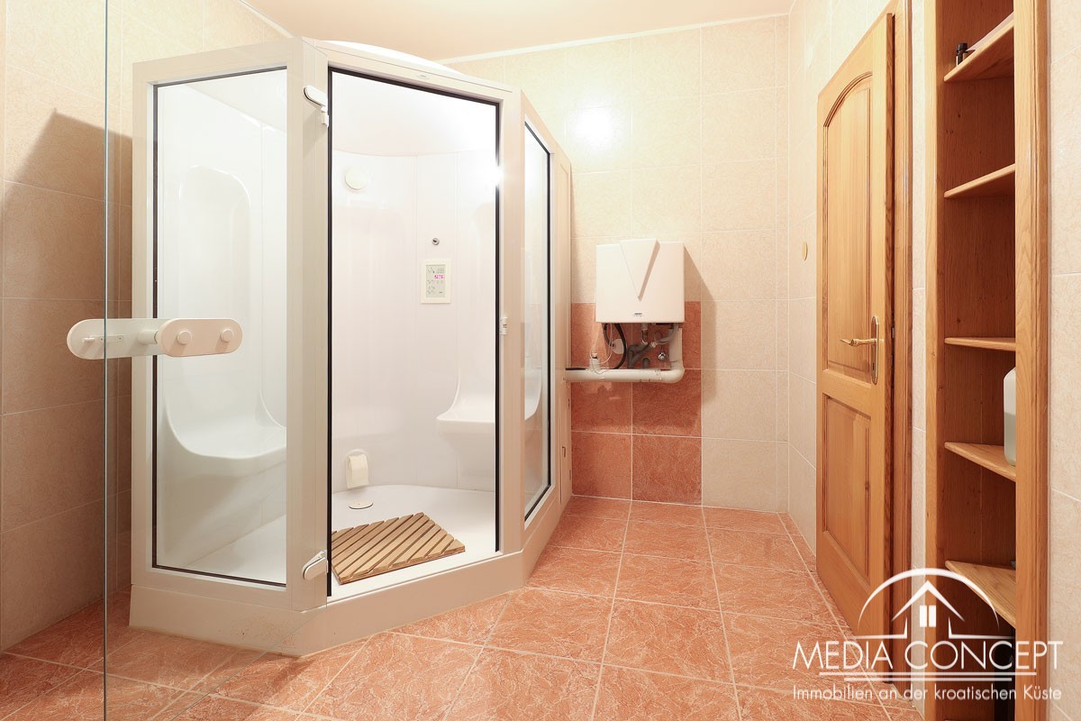 Traumhafte Villa auf halbhöhen Lage über Opatija mit atemberaubende, unverbaubare Panoramablick auf die Kvarnerbucht. Diese 2001, in einer Sackgasse fertiggestellte Villa, bietet auf ca 400 m2 Wohnfläche und auf 1.374 m2 gepflegtem Grundstück, ein hohes Maß an Exklusivität mit modernste luxuriöse Ausstattung. Gesamte Grundstück hat ca. 3.300 m2. Edle Baumaterialien in handwerklich hochwertiger Ausführung verkörpern die Besonderheit des Objektes (schmiedeeiserne Geländer, Betontreppe mit Granit verkleidet, Vollholzzimmertüren, Garderobenzimmer in Volleiche, Dampfbad "Hösch" Sanitäreinrichtung - Duravit -Armaturen "Grohe"). Die ca 400 m2 Wohnfläche verteilen sich über drei Etagen. Der überaus umfangreiche Wohnzimmer mit Landschaftskamin, Luxuseinbauküche und Ess-bereich bilden den Mittelpunkt der ersten Etage. Außerdem, befinden sich in dieser Etage noch ein Schlafzimmer mit Bad, Abstellraum und Gäste-Toilette. In er zweiten Etage befinden sich weitere zwei Schlafzimmer, jedes mit eigenem Bad, Garderobenzimmer und Bibliothek. Alle Zimmer in dem Haus sind lichtdurchflutet, führen zum einladenden Balkon und haben atemberaubenden Panoramablick. In Erdgeschoss befindet sich ein ca 60 m2 großes Büro, Sommerküche, Werkstatt, Dampfbad und Heizungsraum. Nach bedarf kann man aus dieser Etage eine gesonderte Wohnung erstellen. Nasszellen, Wohn - Ess-Bereich und die Küche sind mit hochwertigen spanischen und italienischen Fließen gefliesst und haben zu der klassischen Ölzentralheizung auch die Fußbodenheizung. Mit Whirlpool, Dampfbad "Hösch", exklusive