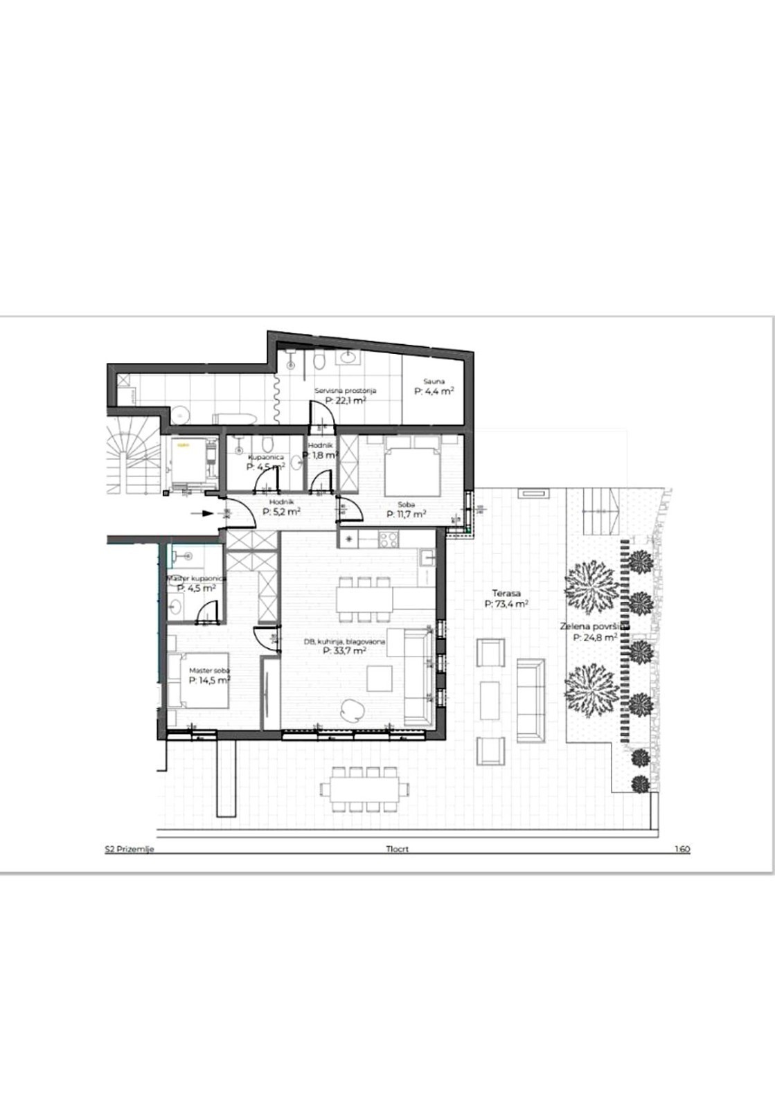 Wir bieten Ihnen eine komfortable, voll möblierte Zwei-Zimmer-Wohnung im Zentrum von Opatija. Die Wohnung befindet sich im Erdgeschoss und besteht aus Flur, Küche, Esszimmer und Wohnzimmer (34,24 m²), zwei Schlafzimmern mit jeweils eigenem Bad, einem Abstellraum, einer überdachten Terrasse (16,94 m²) und einer nicht überdachten Terrasse (46,87 m²). Hinzu kommt ein 21,93 m² großer Garten.