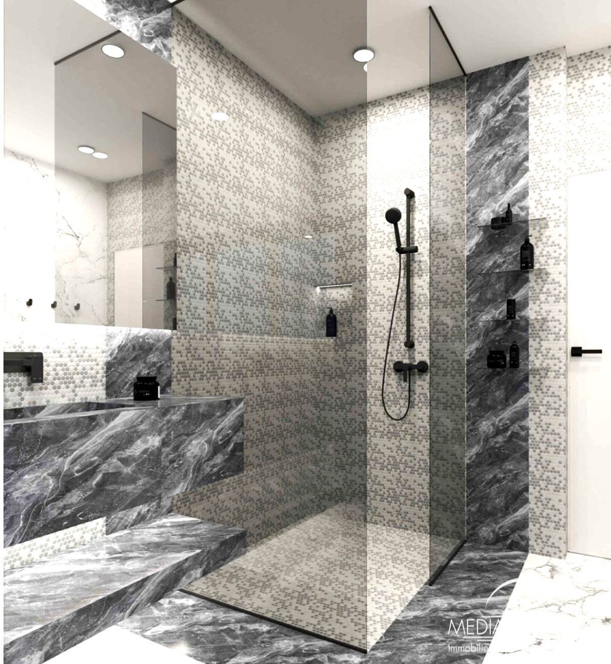 Die Wohnung wird unmöbliert verkauft. Im Preis inbegriffen sind eine maßgefertigte Einbauküche mit hochwertigen Geräten von Miele sowie zwei vollständig ausgestattete Badezimmer.