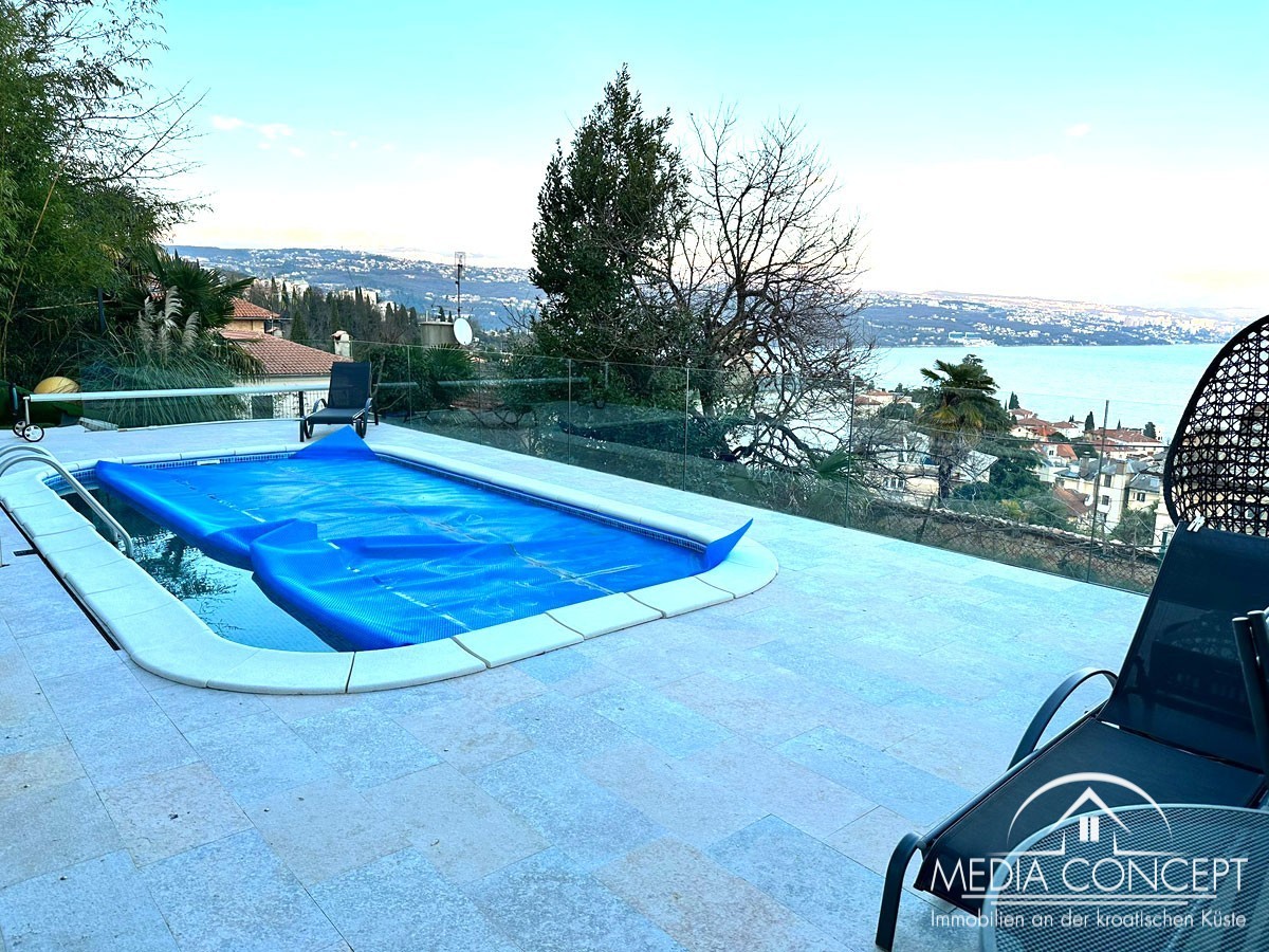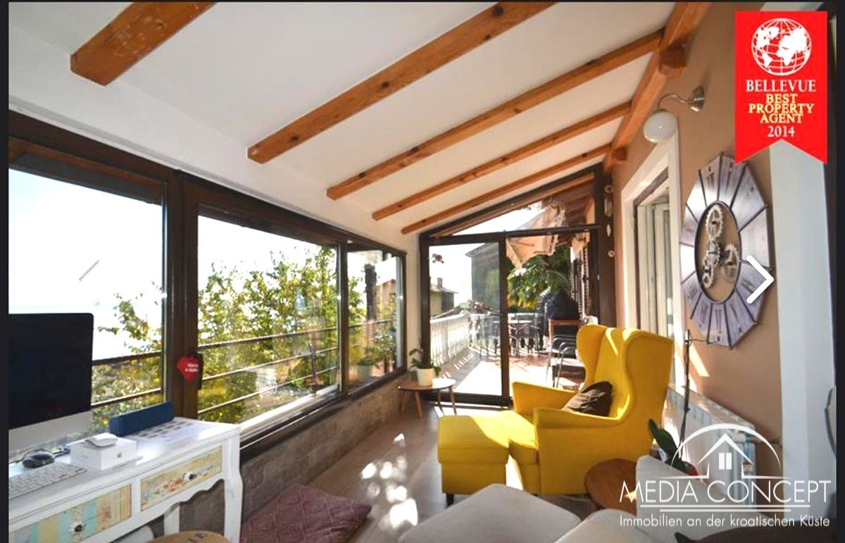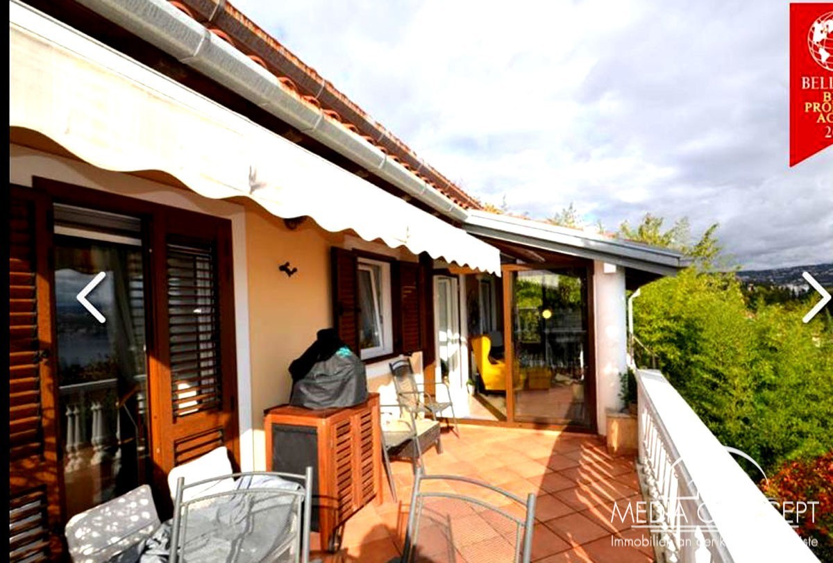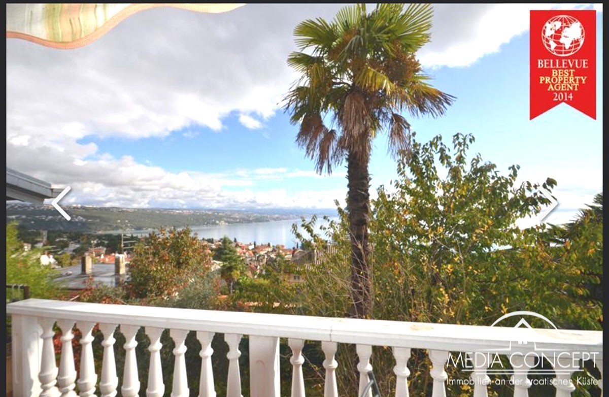 Hiermit möchten wir Ihnen ein alleinstehendes Familienhaus in Opatija, vorstellen und zum Kauf anbieten. Das Haus befindet sich an einer 585 m2 großen Parzelle. Das Haus selbst besteht aus Souterrain und Erdgeschoss. In dem Souterrain befinden sich zwei Appartements mit jeweils ca 22 m2, Heizungsraum und Abstellräume. Vor den Appartements erstreckt sich eine 40 m2 große überdachte Terrasse. In dem Erdgeschoss ist eine großzügige Dreizimmerwohnung. Aus dem Wohnzimmer betritt man Terrasse die zu Hälfte als Loggia eingerichtet ist. Sehr schöne Aussicht auf das Meer, Opatija, Rijeka und die Inselwelt. Pergola mit Sitzgelegenheiten und Kamin. Mediterrane Vegetation schmückt den Garten: Palmen, Zitronen und andere Zierpflanzen. Das Haus ist komplett eingerichtet und so wird es zum Kauf angeboten. 3 Parkplätze gehören zu dem Haus.