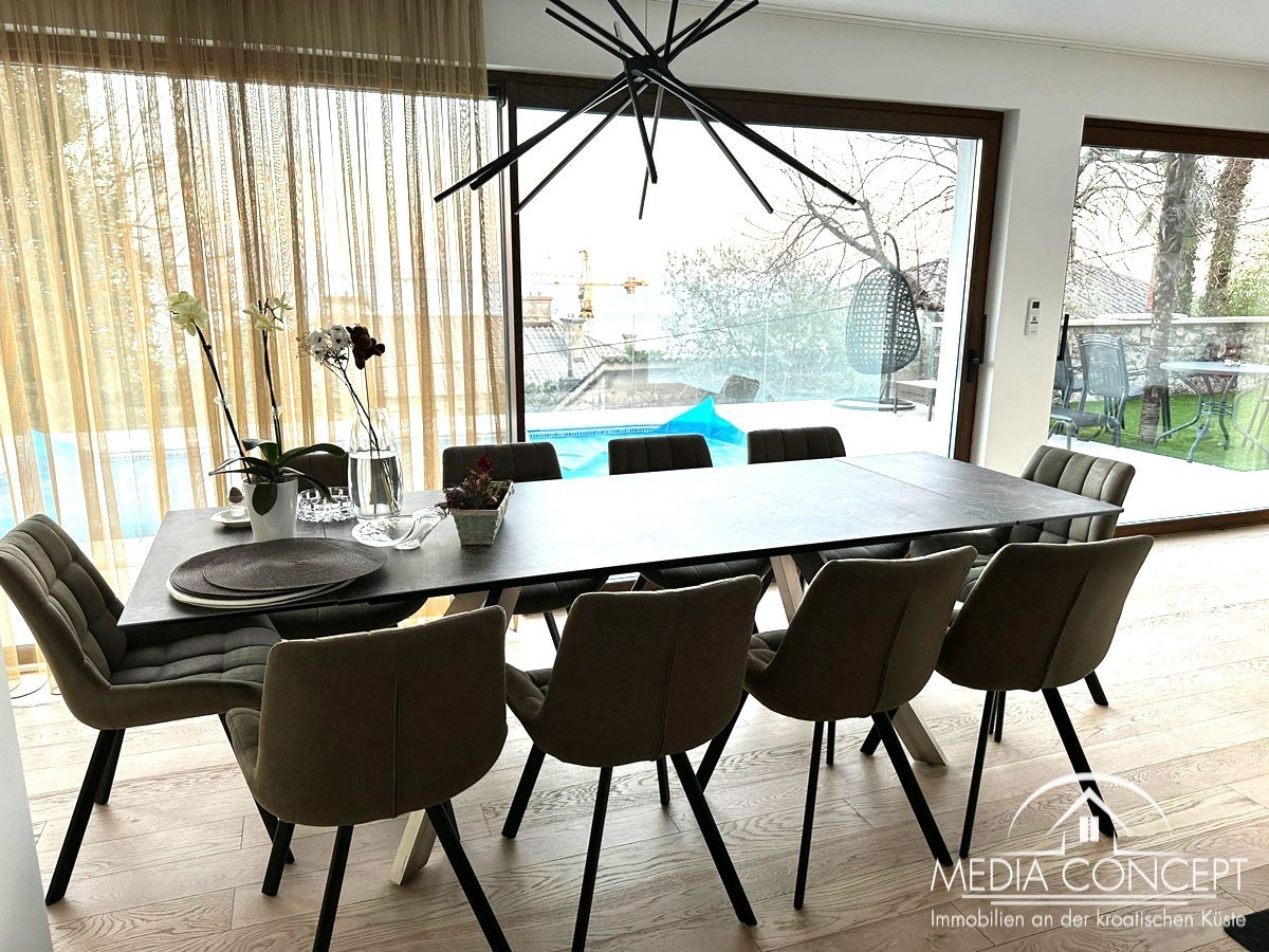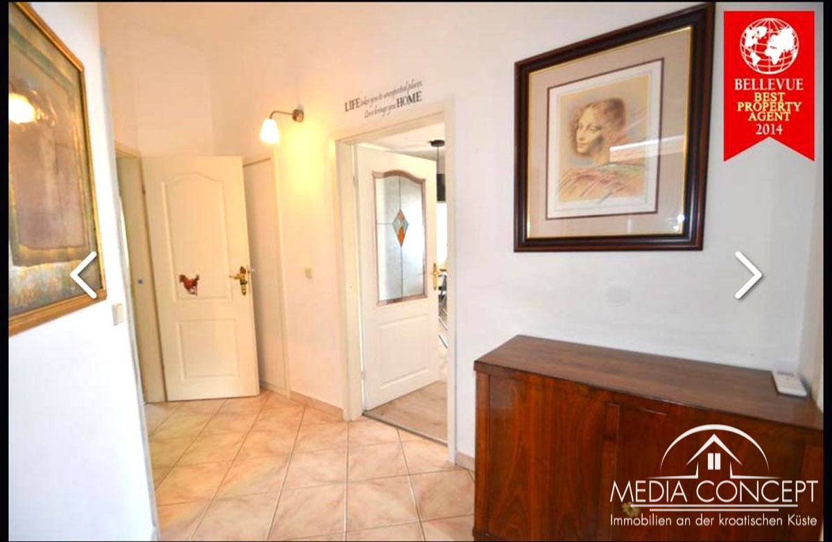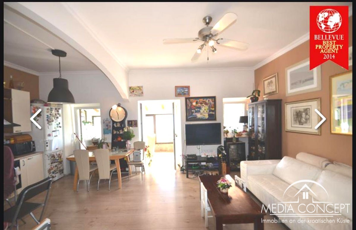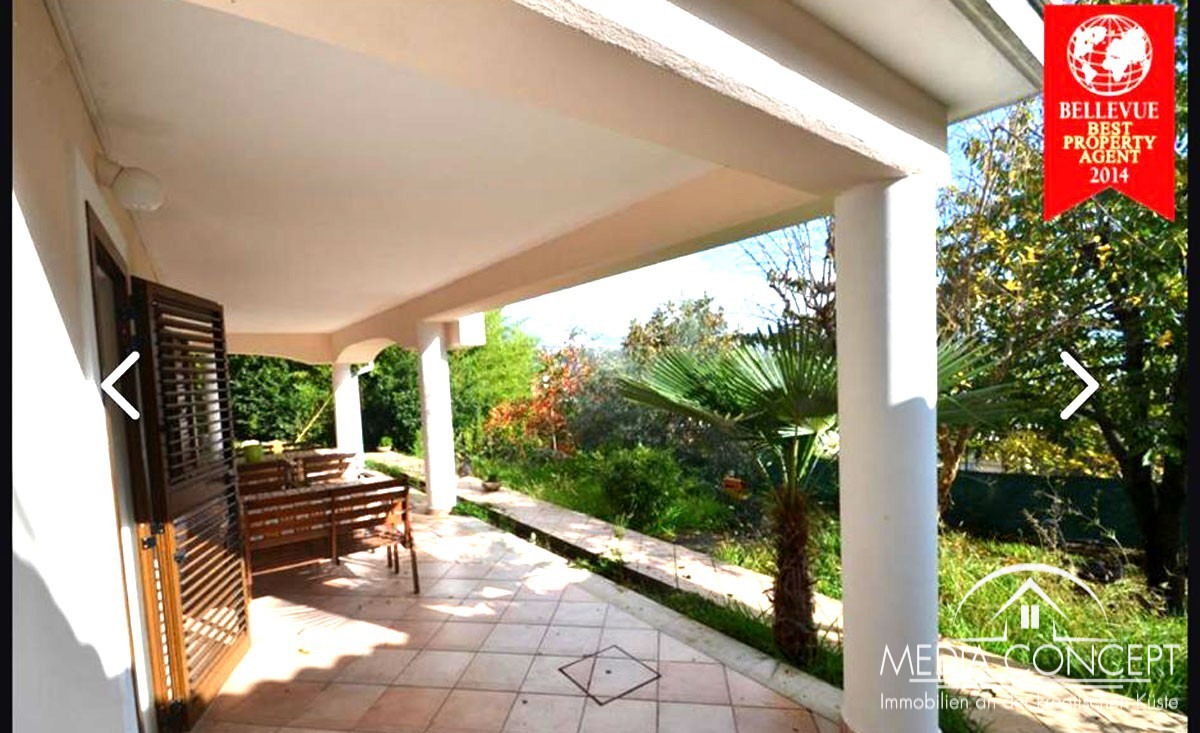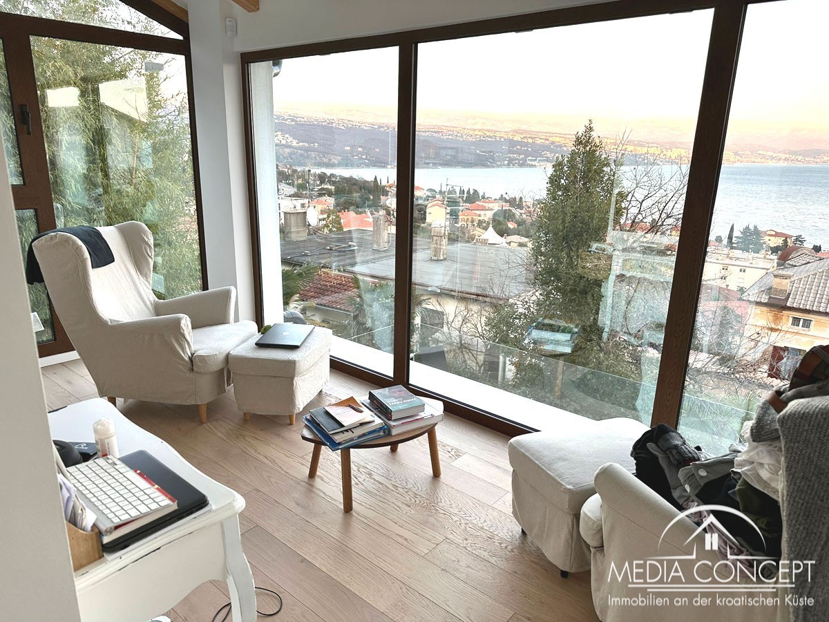 Hiermit möchten wir Ihnen ein alleinstehendes Familienhaus in Opatija, vorstellen und zum Kauf anbieten. Das Haus befindet sich an einer 585 m2 großen Parzelle. Das Haus selbst besteht aus Souterrain und Erdgeschoss. In dem Souterrain befinden sich zwei Appartements mit jeweils ca 22 m2, Heizungsraum und Abstellräume. Vor den Appartements erstreckt sich eine 40 m2 große überdachte Terrasse. In dem Erdgeschoss ist eine großzügige Dreizimmerwohnung. Aus dem Wohnzimmer betritt man Terrasse die zu Hälfte als Loggia eingerichtet ist. Sehr schöne Aussicht auf das Meer, Opatija, Rijeka und die Inselwelt. Pergola mit Sitzgelegenheiten und Kamin. Mediterrane Vegetation schmückt den Garten: Palmen, Zitronen und andere Zierpflanzen. Das Haus ist komplett eingerichtet und so wird es zum Kauf angeboten. 3 Parkplätze gehören zu dem Haus.