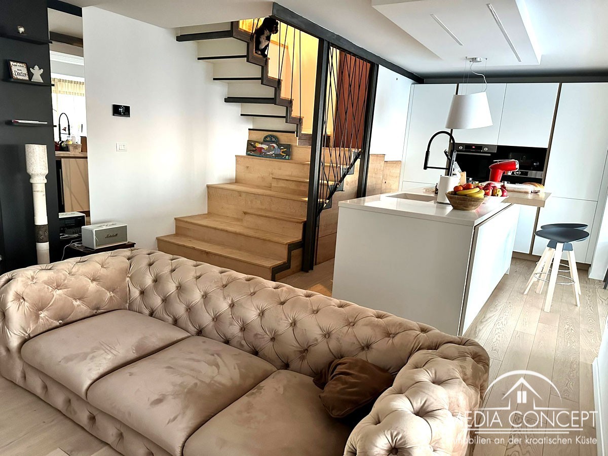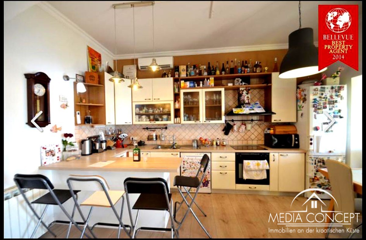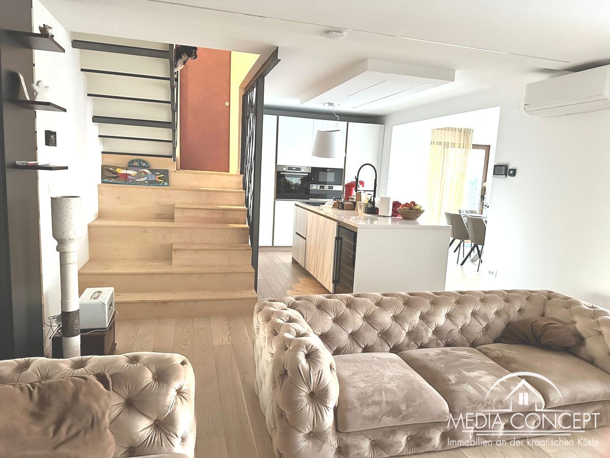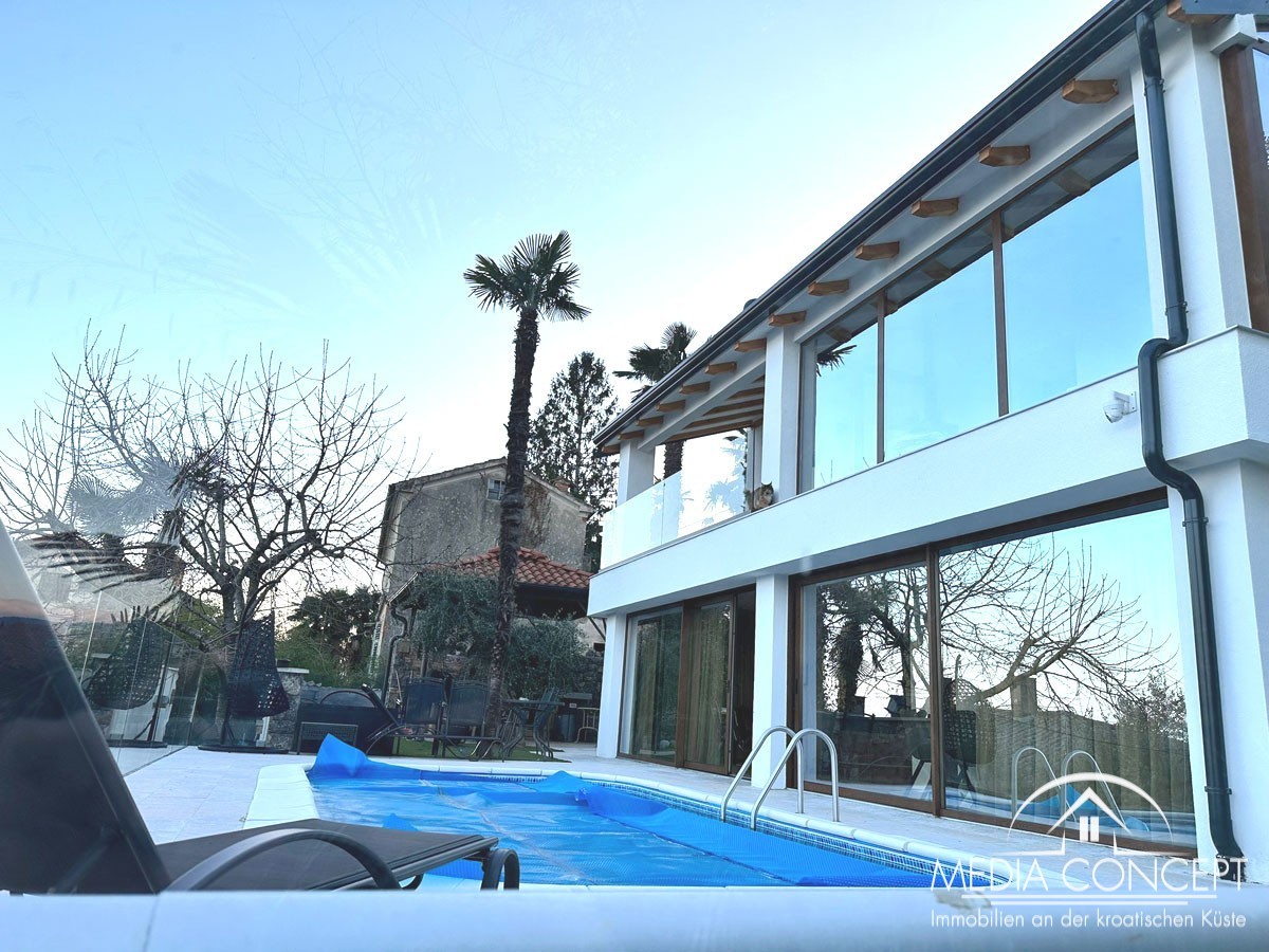 Hiermit möchten wir Ihnen ein alleinstehendes Familienhaus in Opatija, vorstellen und zum Kauf anbieten. Das Haus befindet sich an einer 585 m2 großen Parzelle. Das Haus selbst besteht aus Souterrain und Erdgeschoss. In dem Souterrain befinden sich zwei Appartements mit jeweils ca 22 m2, Heizungsraum und Abstellräume. Vor den Appartements erstreckt sich eine 40 m2 große überdachte Terrasse. In dem Erdgeschoss ist eine großzügige Dreizimmerwohnung. Aus dem Wohnzimmer betritt man Terrasse die zu Hälfte als Loggia eingerichtet ist. Sehr schöne Aussicht auf das Meer, Opatija, Rijeka und die Inselwelt. Pergola mit Sitzgelegenheiten und Kamin. Mediterrane Vegetation schmückt den Garten: Palmen, Zitronen und andere Zierpflanzen. Das Haus ist komplett eingerichtet und so wird es zum Kauf angeboten. 3 Parkplätze gehören zu dem Haus.