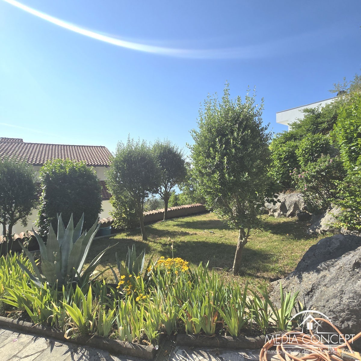 Zu der Wohnung gehört noch 160 m² Gemeinschaftsgarten. Weiterhin gehört zu der Wohnung auch ein angrenzender Garten von 248 m², wo ein Pool untergebracht ist, der nur zu der Wohnung gehört. Zwei Parkplätze gehören auch zu der Wohnung.