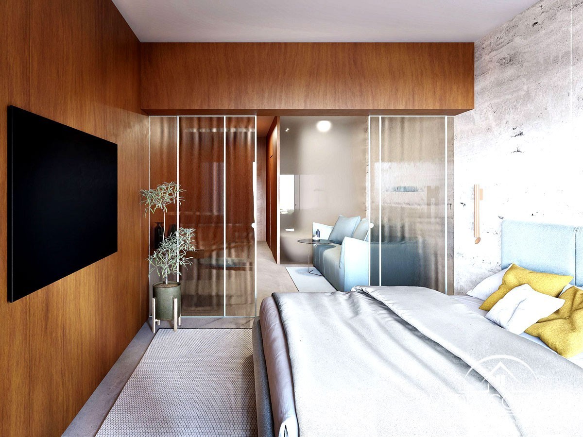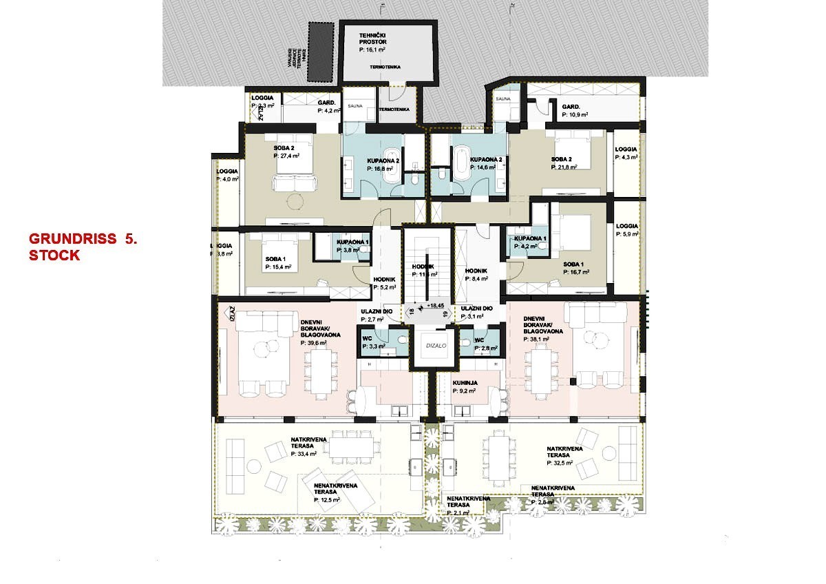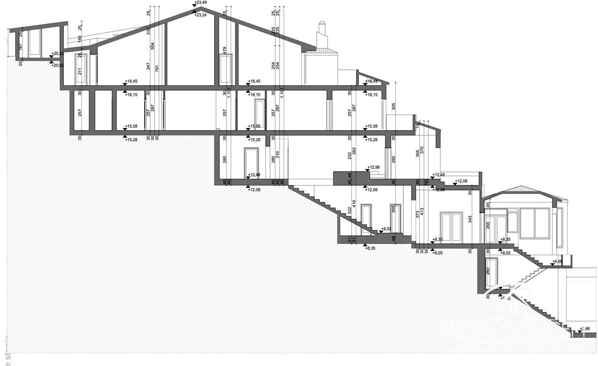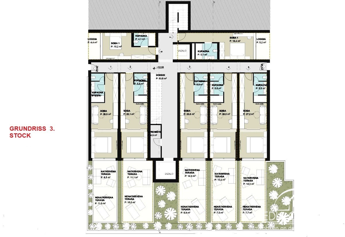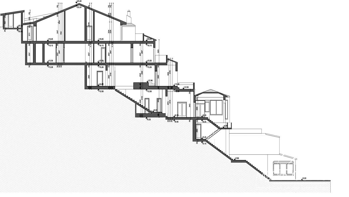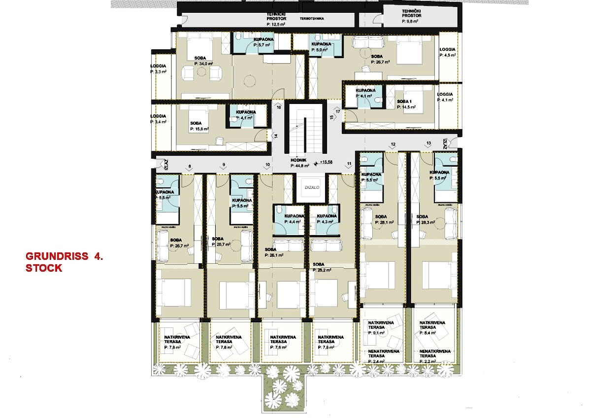 On the third floor there are seven rooms with bathrooms and a reception, on the fourth floor there is one apartment and nine rooms with bathrooms. On the fifth floor there are two apartments and a storage room.