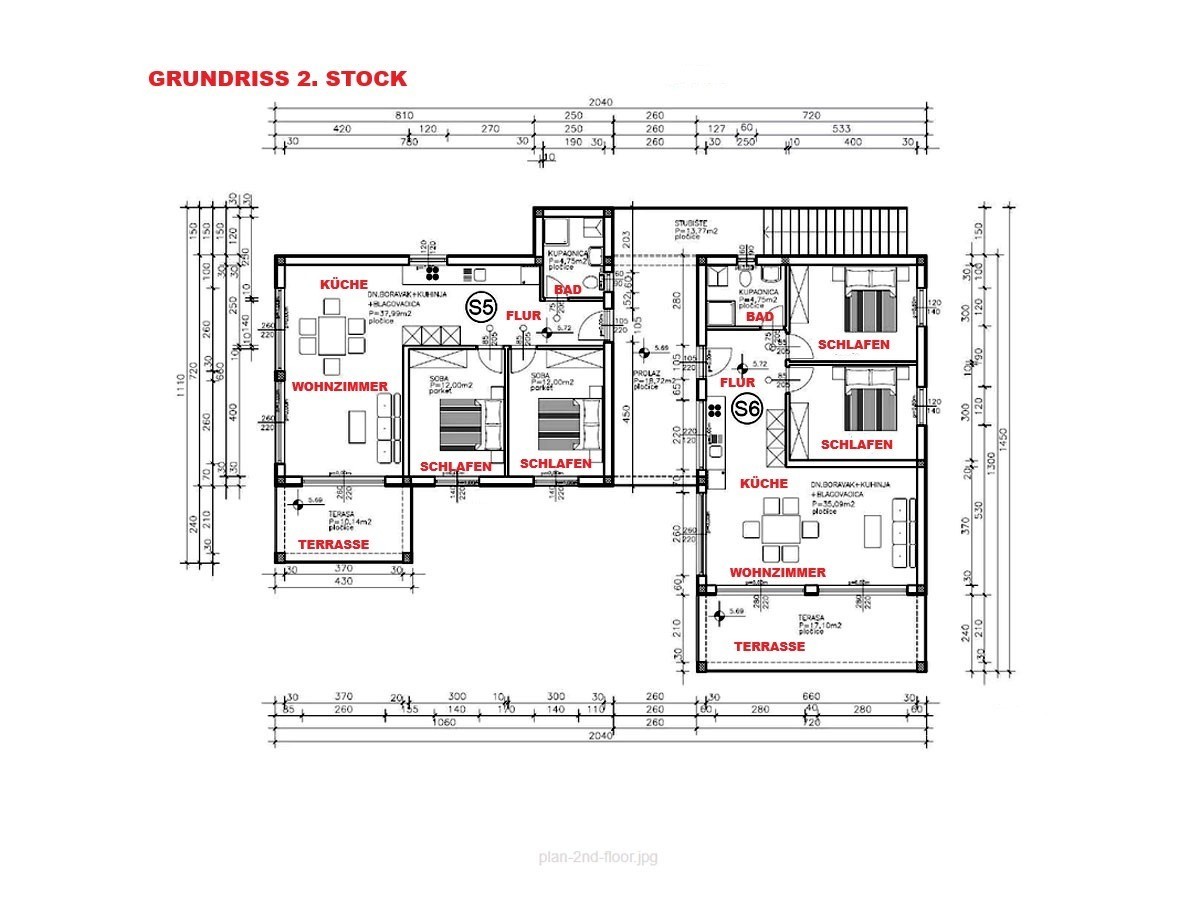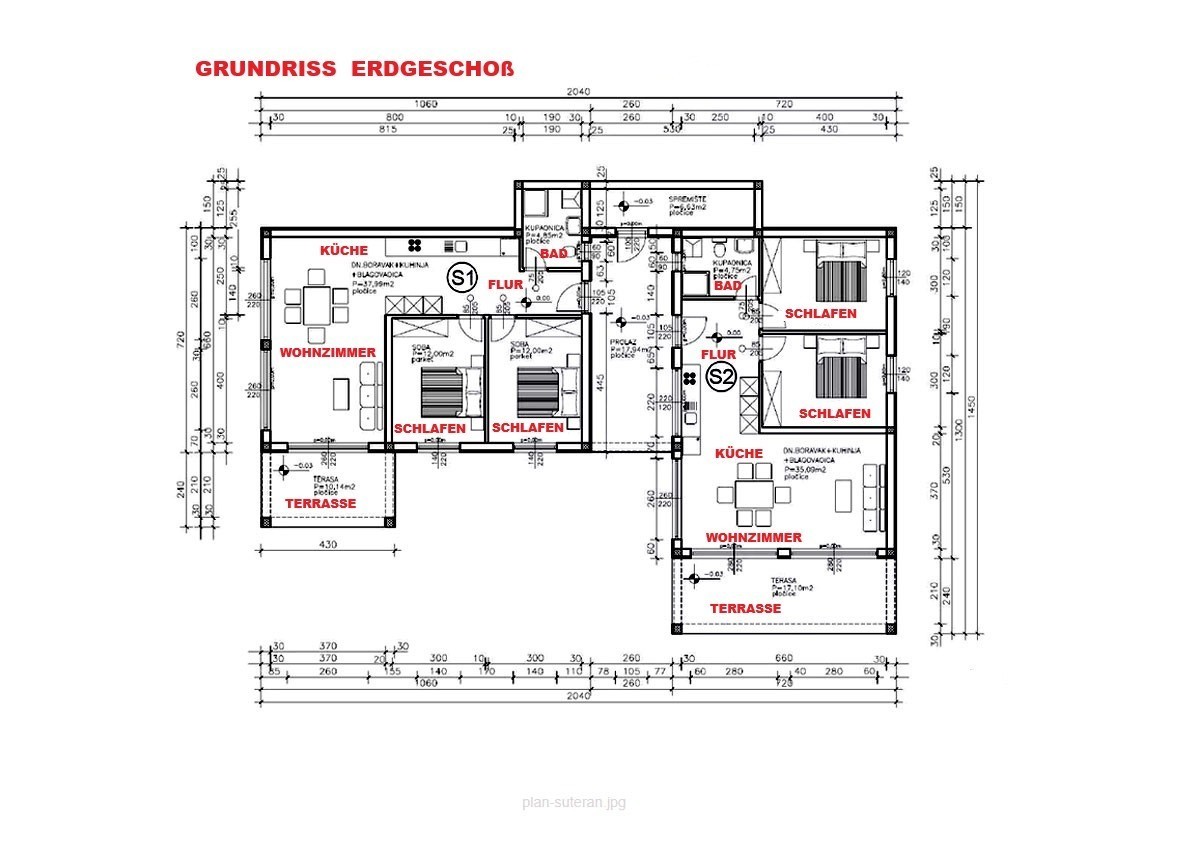 Each apartment has two bedrooms, each 12 m², with large windows.