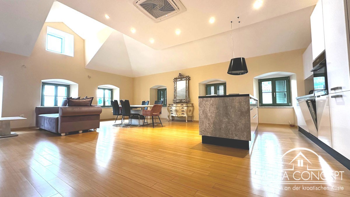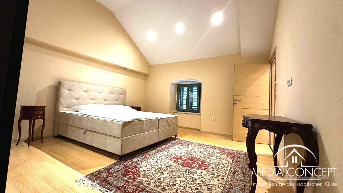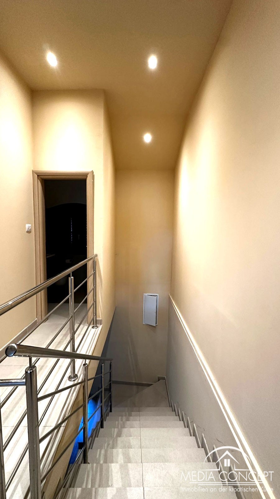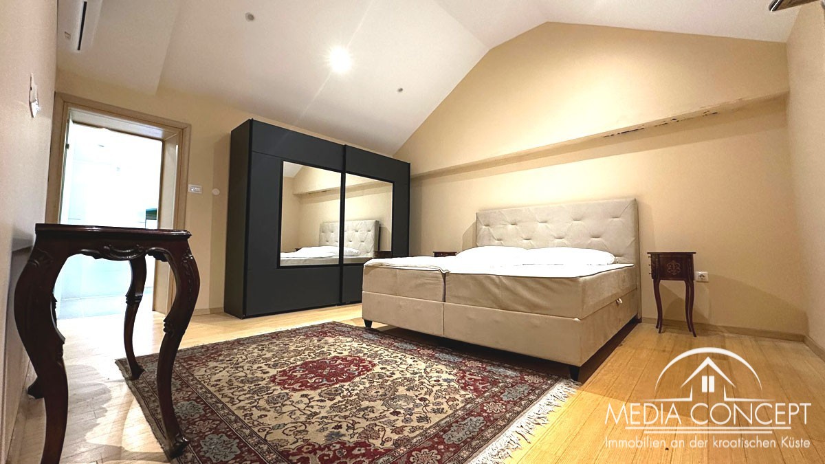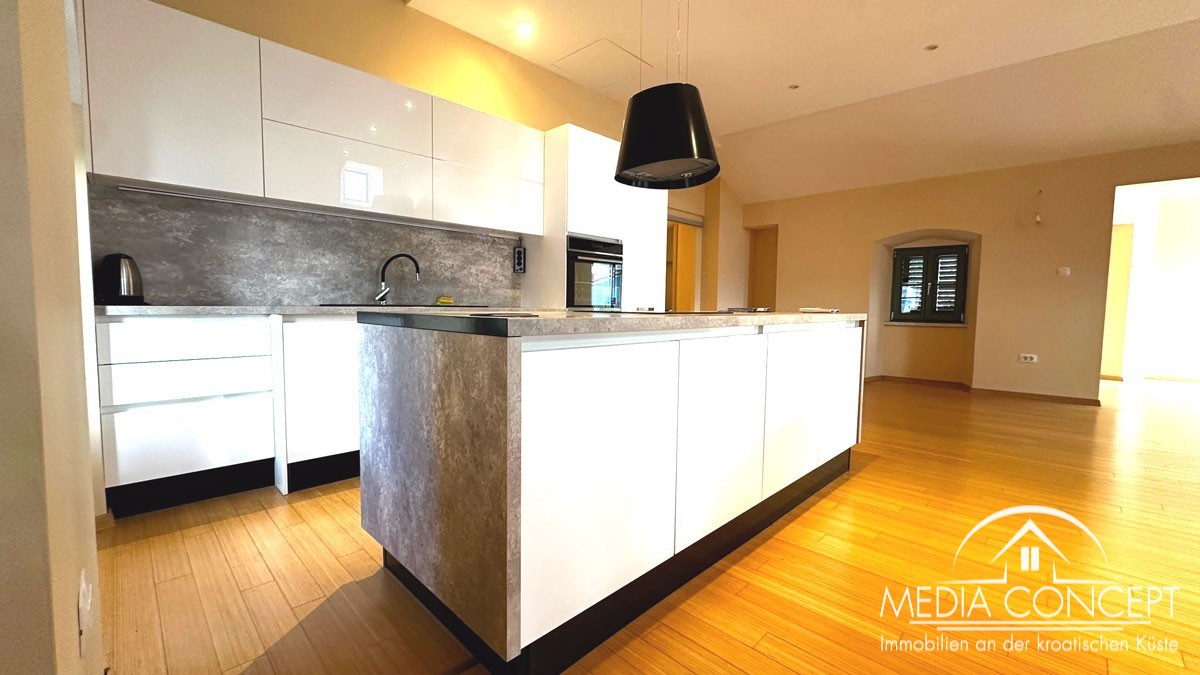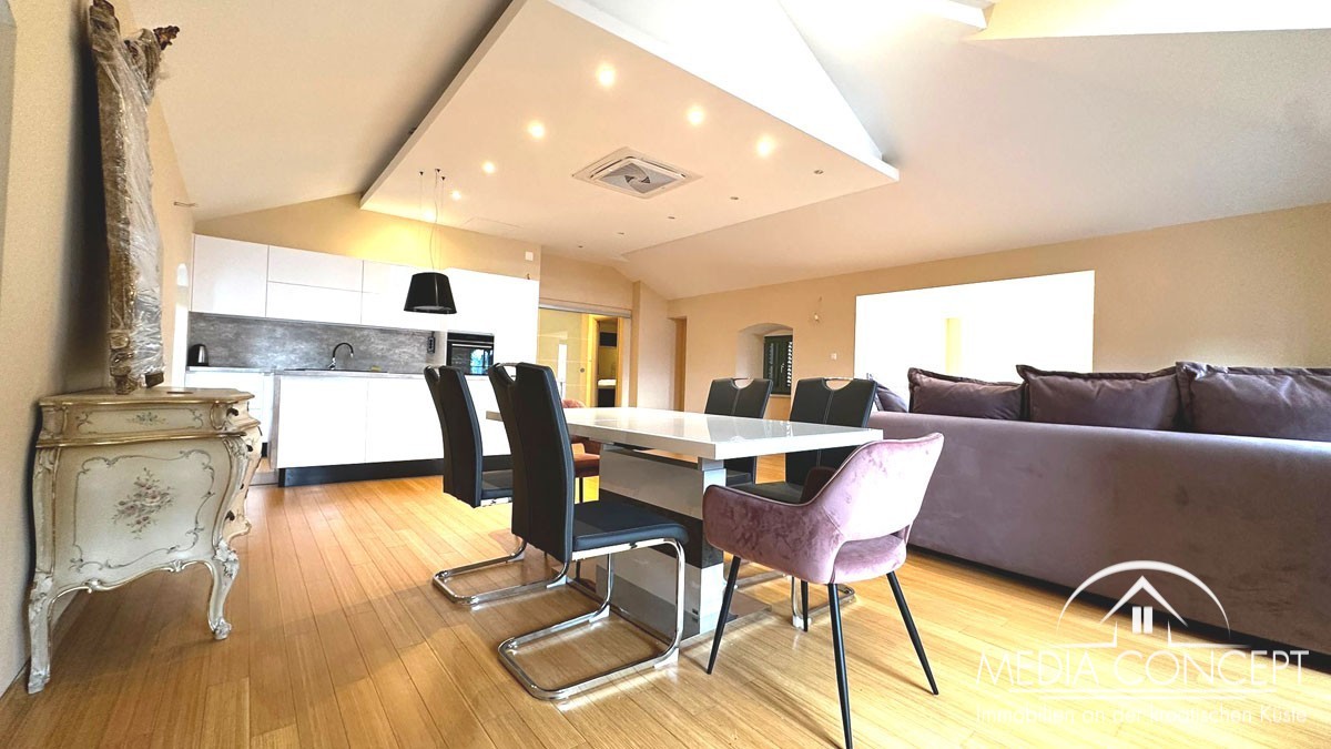 In the basement is a law firm. Upper two floors, which we would like to offer this form, an apartment with a total of approximately 180 m2. This apartment has its own entrance. In the ground floor hall, kitchen with dining area and a storage room. On the floor in any case, there is a nearly 70 m2 large living room with fireplace. From the living room you enter the balcony, from the offers a beautiful sea view. Also located on the first floor, two bedrooms, two bathrooms and a guest WC. Renovations are almost complete. From the outside, the house has been completely renovated: new roof, new wood windows, facade. Inside, the new installations made, ceilings, roof insulation, the floor is bamboo flooring has been laid. Heating - Air. In addition to ground floor is laid. An extraordinary house with a special atmosphere. Parking. No matter what you need, you can reach it in a few steps: shops, post office, bank, pharmacy, cafes, restaurants, everything. That lost the little! Sandy beach is 100 meters away.