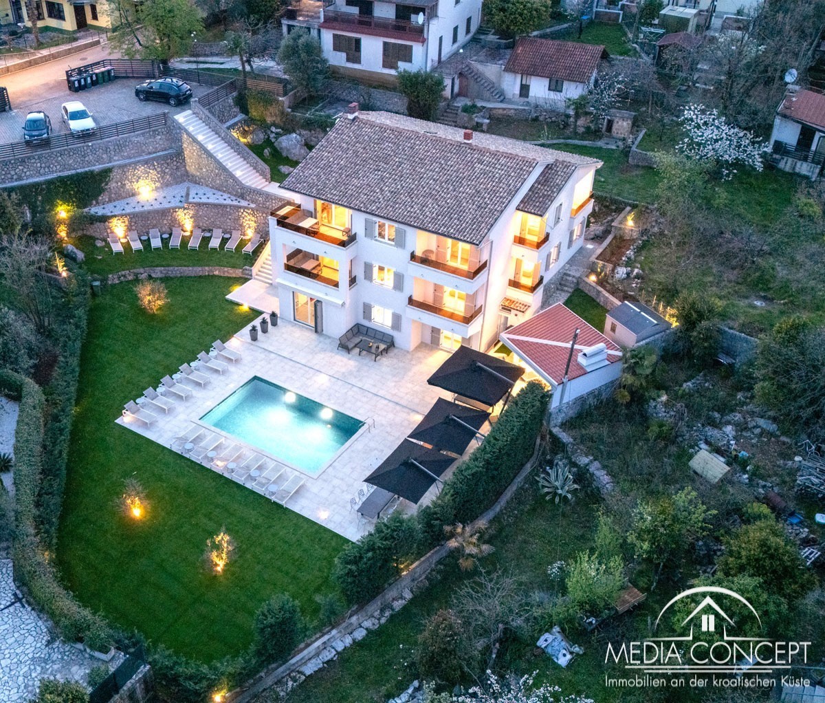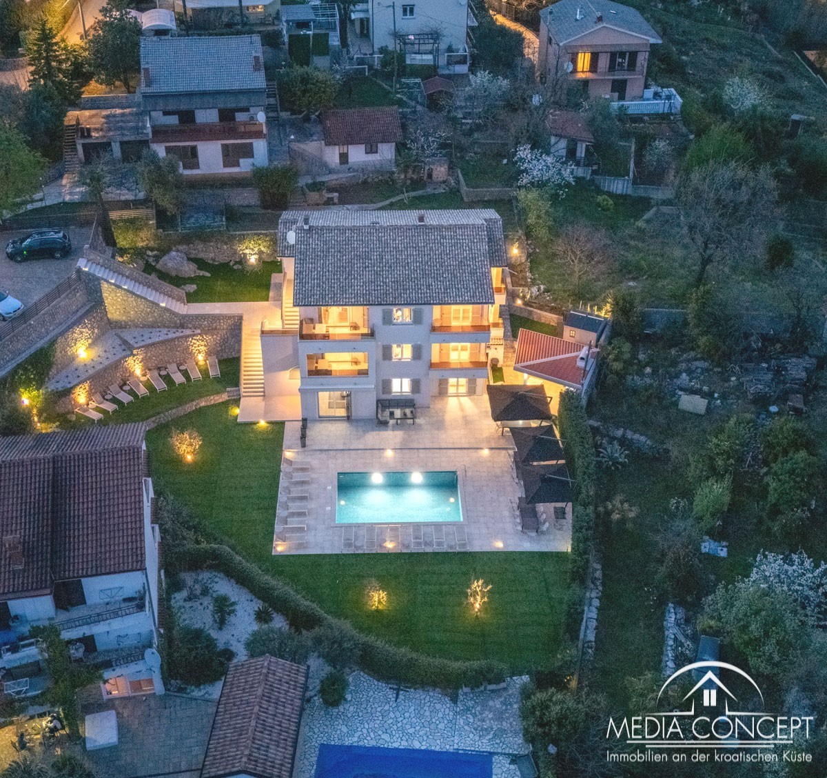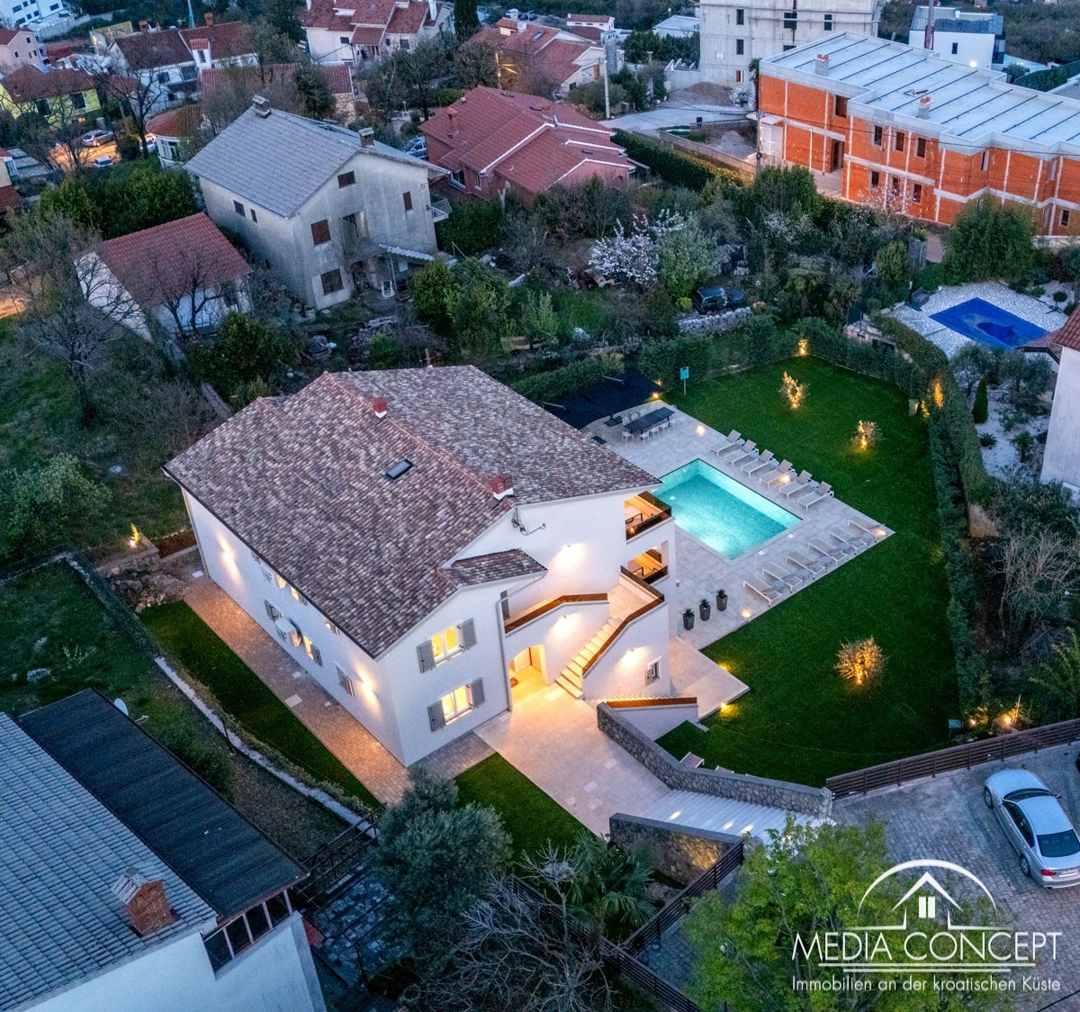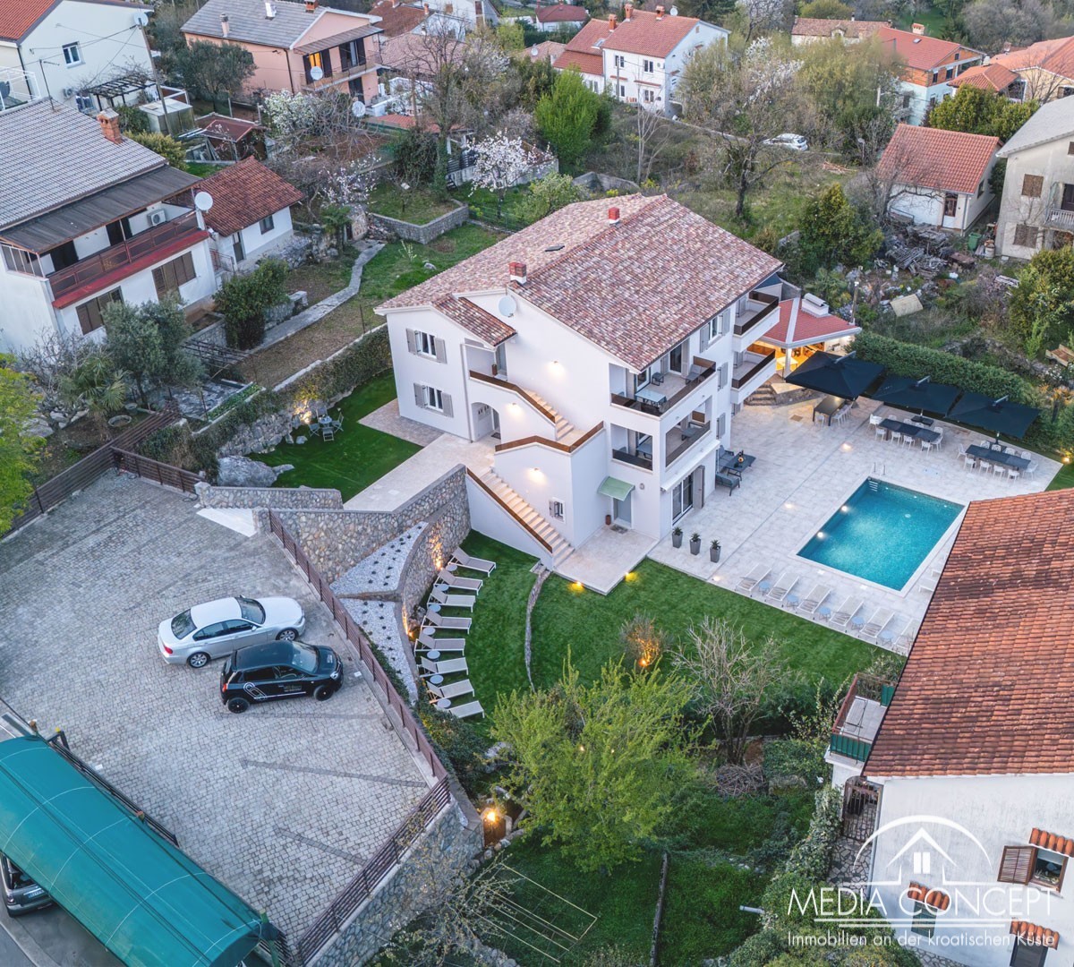 The house is built on a plot of 1,100 m2 and is only 1 km from the center of Opatija. Very quiet location. The two upper apartments have almost the same area and are identical. They consist of: hallway, kitchen, dining room and living room, guest toilet, 4 bedrooms, 2 bathrooms, laundry room and wardrobe. The living room as well as the bedroom have their own balcony and a beautiful view of the sea. There is a 97 m2 apartment on the ground floor. In the basement, there is a tavern of about 70 m2, where, among other things, the loggia will be located. Central heating with heating oil. Very high quality PVC joinery. The distance from the shop and bus station is 200 m, from the restaurant 300 m. In front of the house there is a large swimming pool for the whole house.