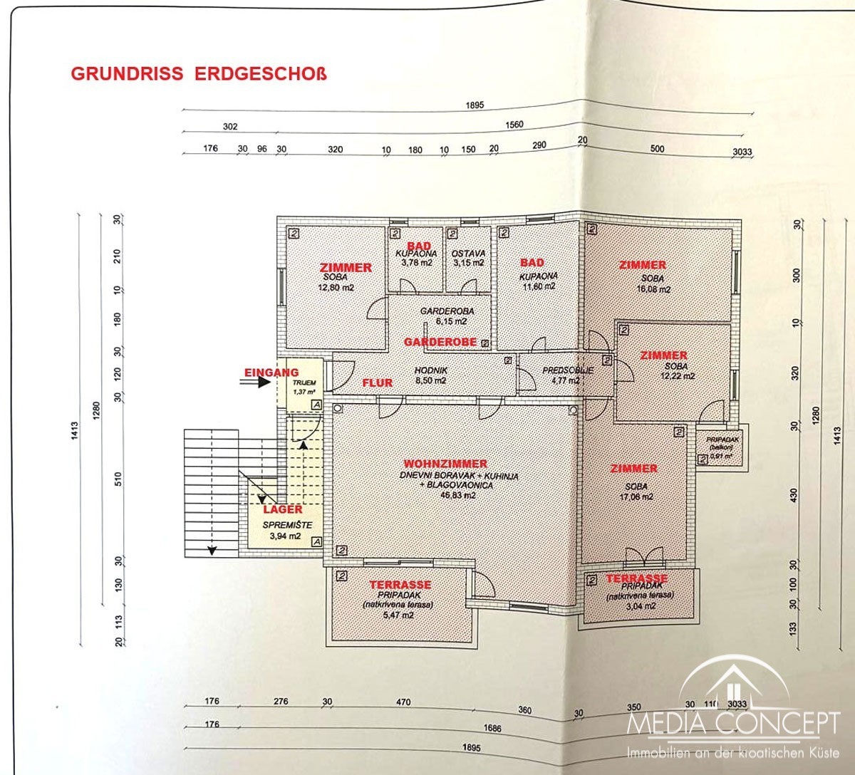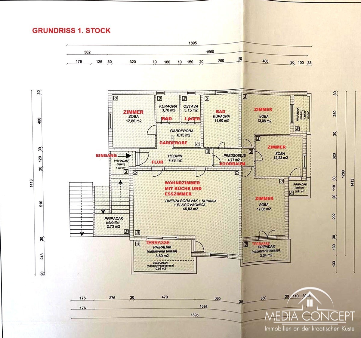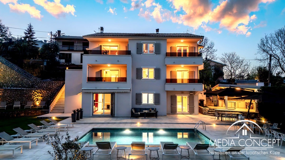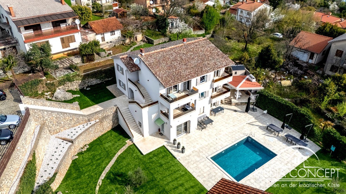 The house is built on a plot of 1,100 m2 and is only 1 km from the center of Opatija. Very quiet location. The two upper apartments have almost the same area and are identical. They consist of: hallway, kitchen, dining room and living room, guest toilet, 4 bedrooms, 2 bathrooms, laundry room and wardrobe. The living room as well as the bedroom have their own balcony and a beautiful view of the sea. There is a 97 m2 apartment on the ground floor. In the basement, there is a tavern of about 70 m2, where, among other things, the loggia will be located. Central heating with heating oil. Very high quality PVC joinery. The distance from the shop and bus station is 200 m, from the restaurant 300 m. In front of the house there is a large swimming pool for the whole house.